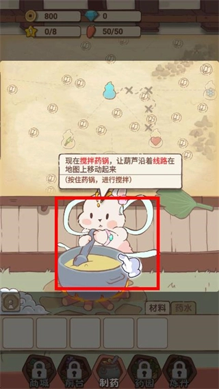 搅拌制药的操作流程是:在所有材料投放完毕后,按住药锅执行搅拌动作,使药材按照设定路线在地图上移动,通过完成这一搅拌步骤来推动制药进程向前发展。
