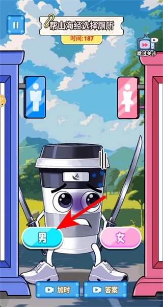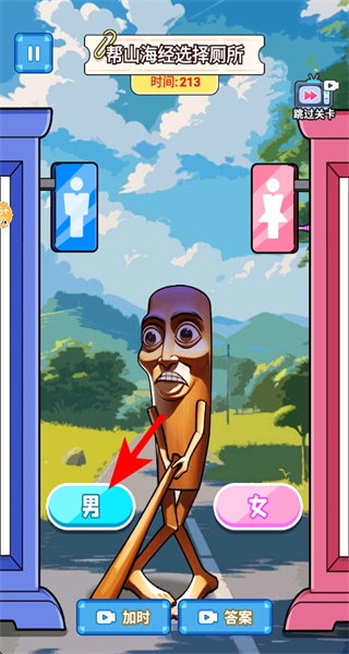当关卡里出现鲨鱼模样的山海经角色时,点击下方的男按钮,完成厕所分类的选择。