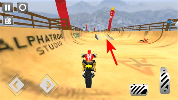 跟着红色箭头的指引,操控摩托车朝着赛道里的目标区域行进,比如那些带有红色标识的坡道,利用赛道的地形来完成跳跃之类的特技动作。