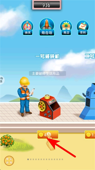 进入场景后,按照红色箭头的提示,点击升级按钮来提升破碎机的性能,以此提高它破碎物品的效率和收益。