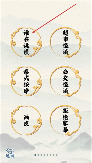 进入关卡选择界面后,能看到“谁在说谎”“超市怪谈”等关卡选项,点击对应关卡就能进入游戏,也可以点击返回按钮回到启动界面。