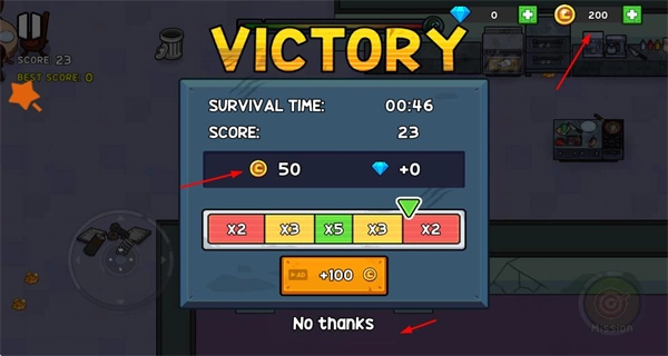 关卡胜利后,既能领取金币奖励,也能选择观看视频来获取翻倍收益;点击“No thanks”就会直接结算并进入下一环。