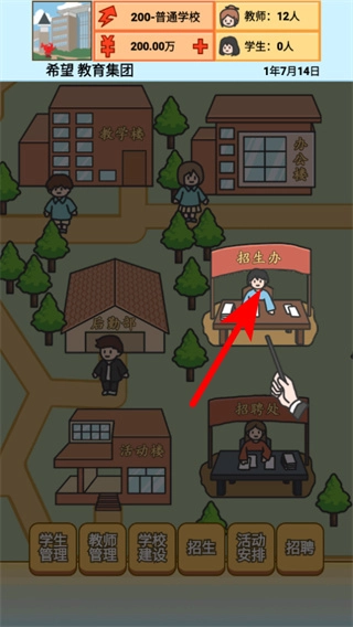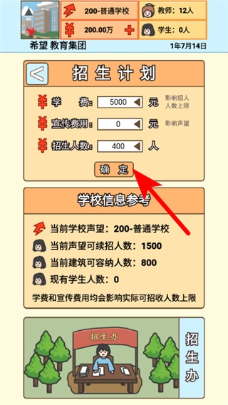 点击招生办区域是开启招生流程的首要步骤,进入该区域后,能够对学费、宣传费用等招生相关参数进行设置,从而为学校吸纳学生做好前期准备。