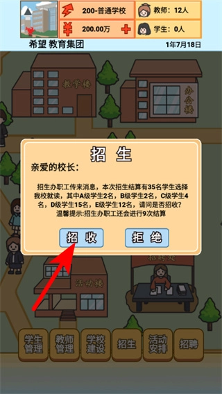 点击招收按钮确认录取学生,这是完成招生结算的关键操作,能将该批次学生正式纳入学校,增加在校学生人数,推动运营进程。