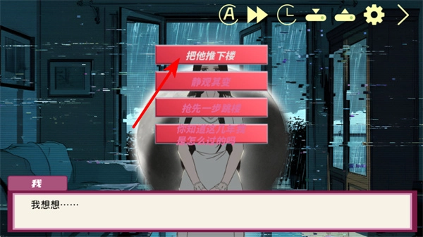 按照箭头所指的方向,点击“把他推下楼”这个选项,就能选定该剧情分支,进而触发与之对应的场景情节变动。