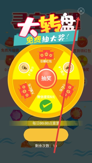 您可参与大转盘抽奖活动,使用10次抽奖机会尝试抽取大额红包等丰厚奖励;若不想参与,也可按照箭头提示点击按钮关闭该活动界面。
