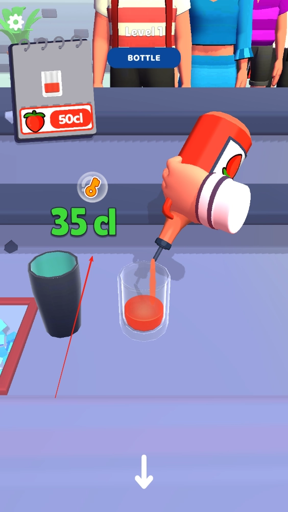 按照顾客的药球配方来制作饮品,若客人要求50cl的草莓汁,就拖动草莓汁直到刻度显示50cl时松手,再把草莓汁倒入调酒杯中。