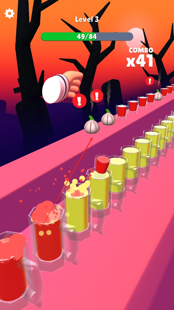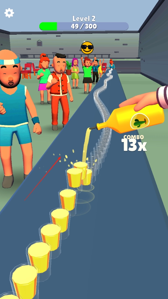 这一关卡的任务是把上方的饮品推进酒杯,点击屏幕就能推动酒瓶,记得别让蒜掉进酒里。