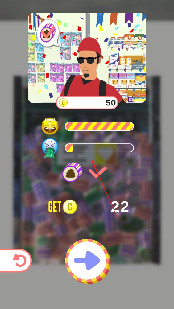 挑选匹配口味、颜色与造型的糖果来制作,点击屏幕就能切割糖果,要是客人露出开心的表情就说明符合其需求,而蓝色表情则意味着客人不满意。