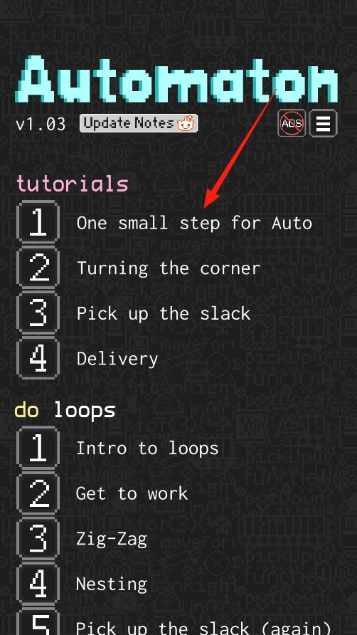 这是教程选择界面,你可以通过数字键1到4来选择基础教程,像Turning the corner就是讲解转弯技巧的;界面下方还有专门的循环教程区域,不同的教程会对应解锁相应的编程知识点。