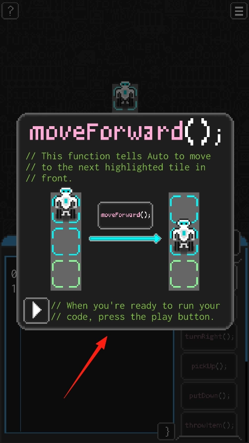 游戏开局会向你介绍助手Auto,你需要借助右侧的指令为它编写程序,每个指令都能让机器人做出不同的动作,像throwItem指令就可以让它抛掷物品,先尝试把这些基础指令组合起来去完成任务吧。