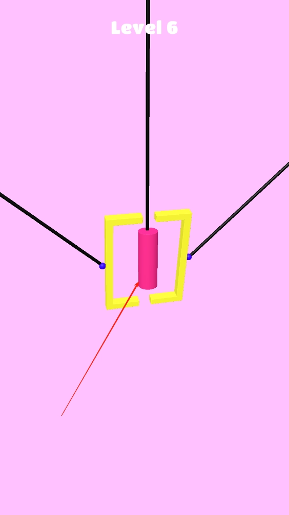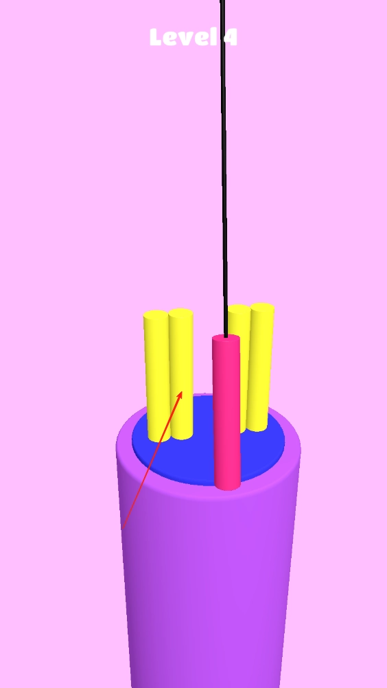 四根黄色棍子会持续旋转,当它们转到正对着粉色棍子的位置时,点击屏幕,让粉色棍子在四根黄色棍子之间来回摆动且不发生碰撞。
