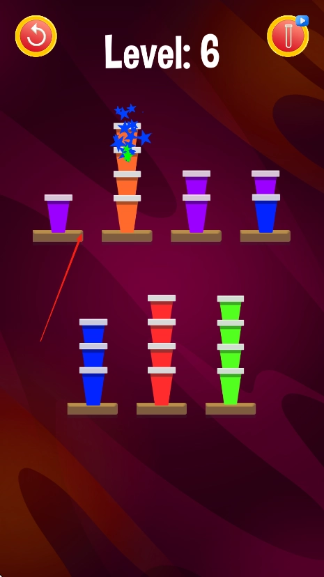 观察当前关卡里纸杯的颜色种类和数量,以把相同颜色的纸杯归到同一类为目标,点击纸杯进行选中并移动它。