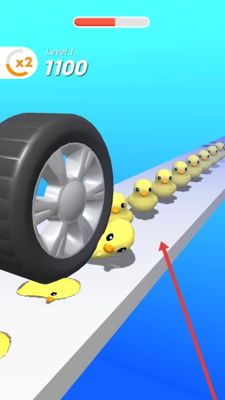 在第一关里,操控滚动的轮胎去碾压路面上的小鸭子,让轮胎一直往前滚动,努力拿到更高的分数。