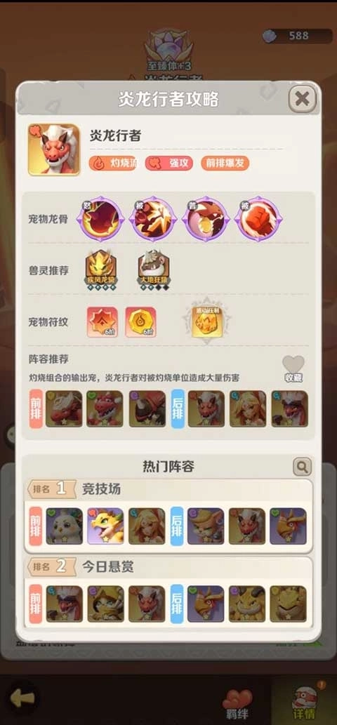 1、火系最强:以炎龙行者为主c,灼烧组合的输出宠,炎龙行者对被灼烧单位造成大量伤害。
