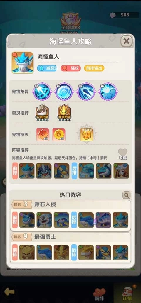 3、水系最强:以海怪鱼人为核心,利用海怪鱼人输出且降攻加盾,延后战斗回合,持续【中毒】消耗。
