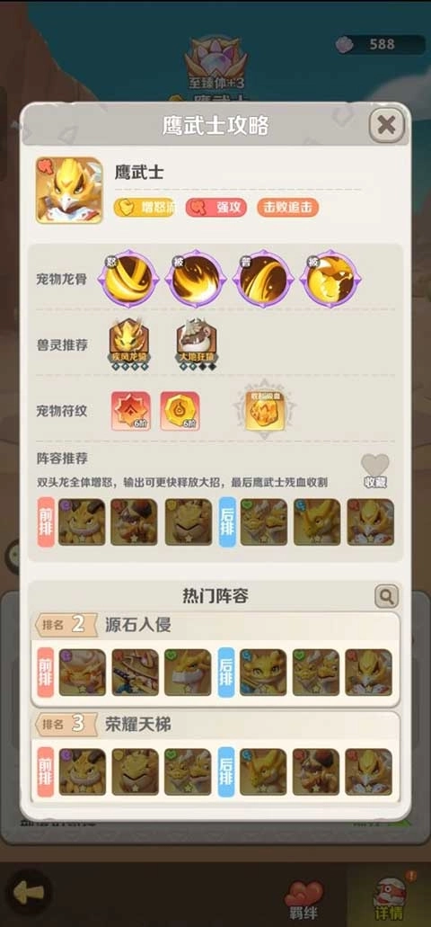 2、风系最强:以鹰武士为核心,双头龙全体增怒,输出可更快释放大招,最后鹰武士残血收割。