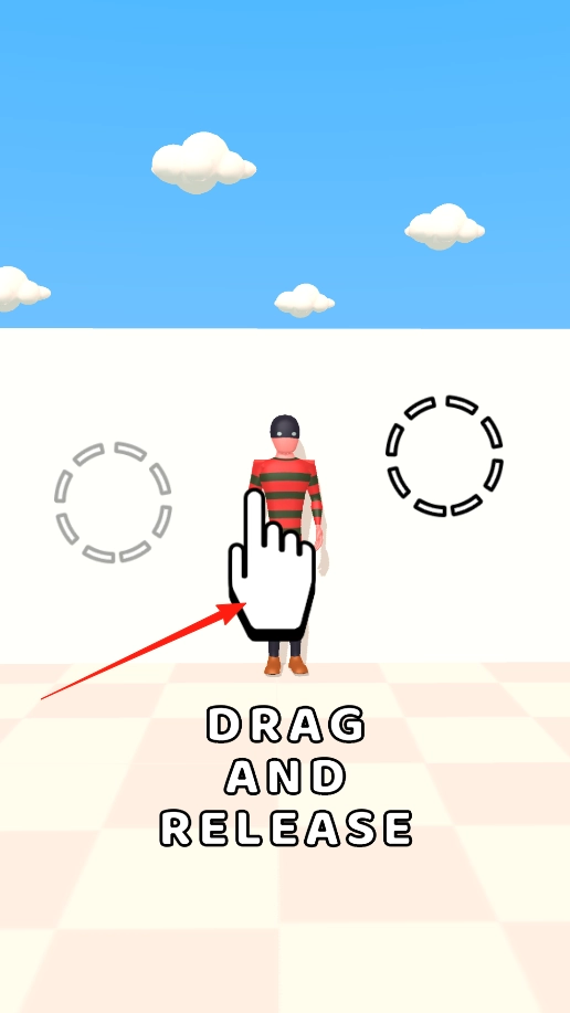 在胶带层层缠绕的界面上,拖动角色并松开手指使其弹射而出,借助调整拖动的方向与力度,把控角色的弹射轨迹,尝试触发各类不同效果,以此体验弹射的操作机制。