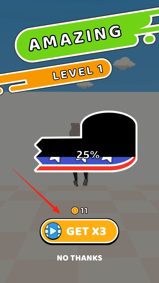 完成第一关后,界面会呈现奖励选项。你可以点击GETX3,通过观看广告来获取三倍金币;也可以选择NO THANKS,直接领取基础金币。通过这样的选择来获取奖励,可用于后续关卡,从而体验奖励结算的玩法。