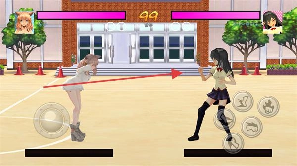 格斗对战,操控选好的角色,在操场用虚拟摇杆移动,点击技能按钮,攻击对手,消耗其血量。