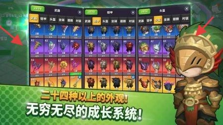 在装备界面,你可以收集或升级武器、铠甲、头盔(拥有24种以上外观),借助成长系统来提升战力,还能对角色外观进行定制。