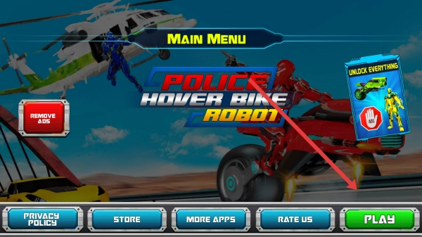 点击主菜单中的【PLAY】选项,进入【Police-Hover-Bike-Robot】游戏,开启机甲摩托的竞速与战斗冒险之旅。
