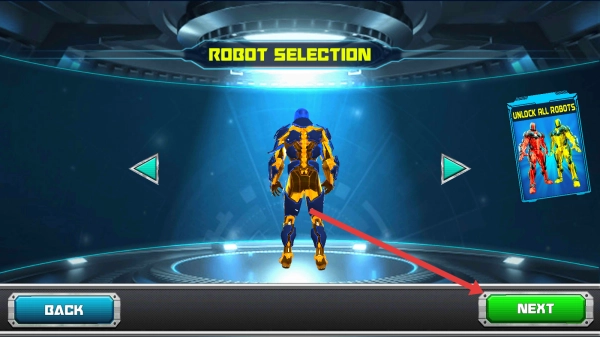 在机器人选择界面,选定黄色机甲后点击【NEXT】按钮,即可进入关卡选择页面,为挑战各类场景任务做好准备。