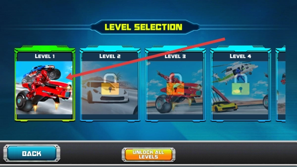 选择【LEVEL-1】(红色摩托关卡)开启第一关,操控机甲摩托达成竞速或战斗目标,即可解锁后续关卡。