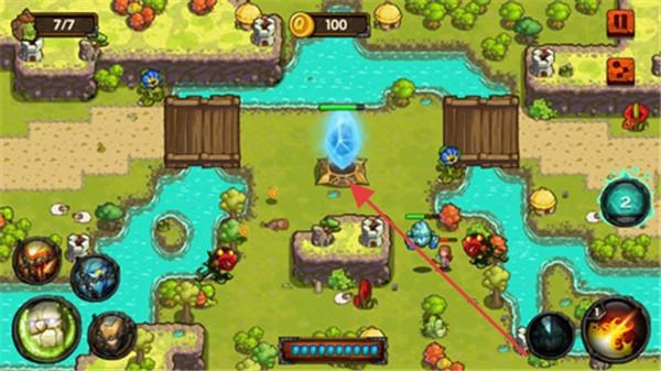 在战斗关卡界面中,玩家可布置防御塔与英雄进行作战,目标是守护位于中央的核心(蓝色水晶)。通过运用策略性防御手段抵御敌人的进攻,充分展现出塔防玩法的核心乐趣。