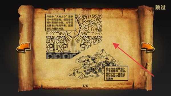 游戏剧情卷轴界面,讲述“大树之力”“图尔巴巴”等背景故事,可点击箭头翻页,了解世界观设定。