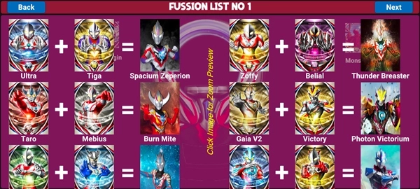3、点击右上角fussion list可以查看欧布奥特曼不同形态的合成方式;