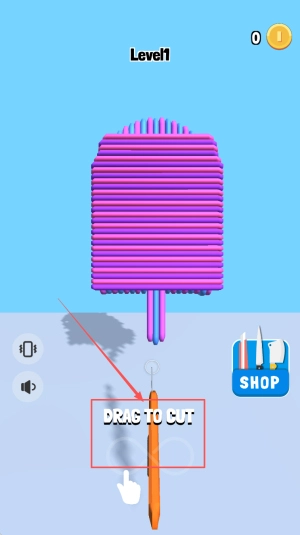 启动游戏的步骤如下:首先打开对应的应用程序,进入主界面后找到标有“DRAG TO CUT”字样的按钮并点击,即可直接进入第一关开始游戏。