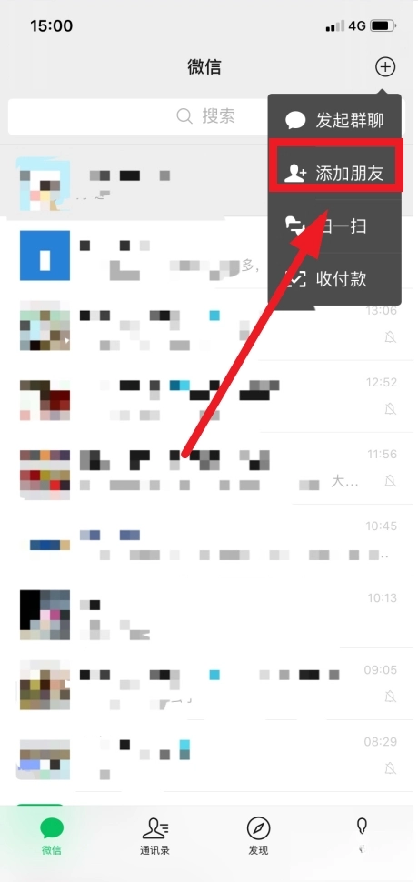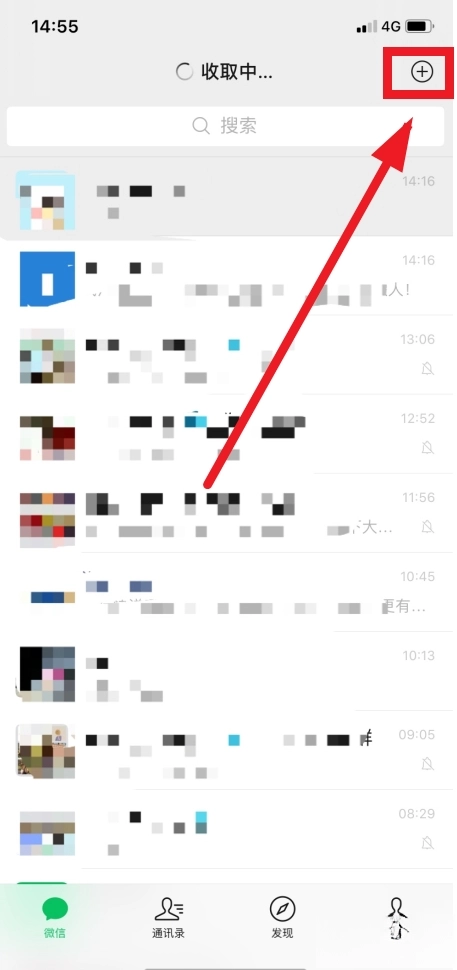 打开手机微信,点击右上角+。