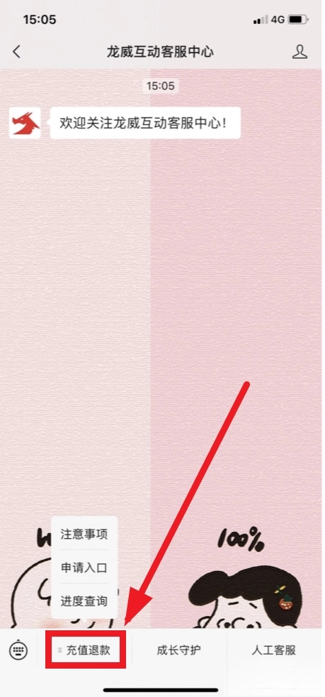 进入公众号,点击右下角充值退款。