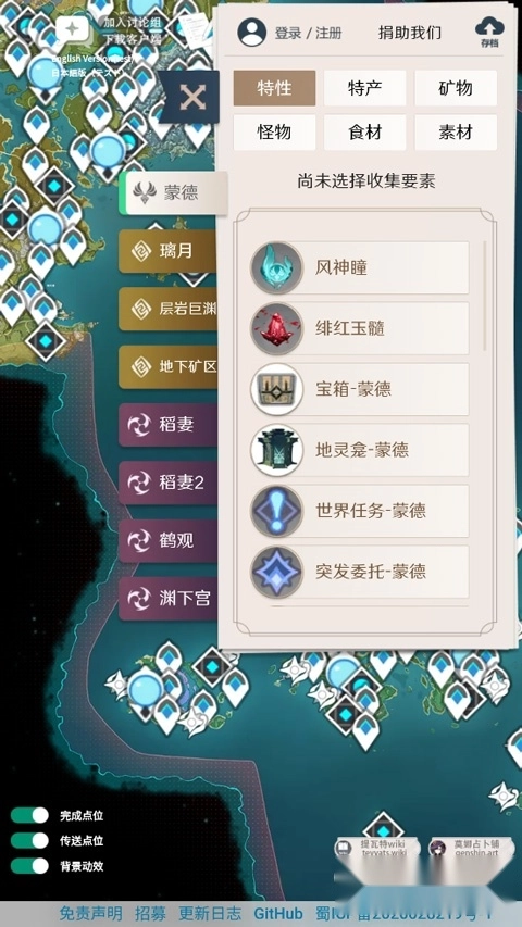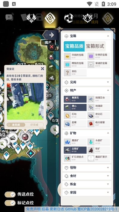 3、提供了风神瞳、岩神瞳、宝箱、野外boss、七天神像、NPC、传送点、地灵龛、矿物、秘境等各类资源点的详细分布位置。