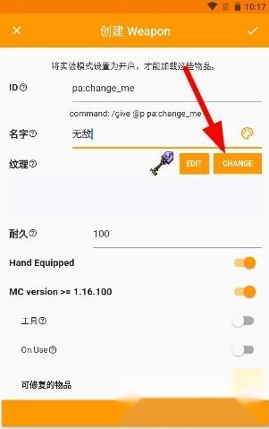 5、选好物品后进入编辑界面,id无需修改,名字可自行输入,然后点击文字较多的那个按钮。