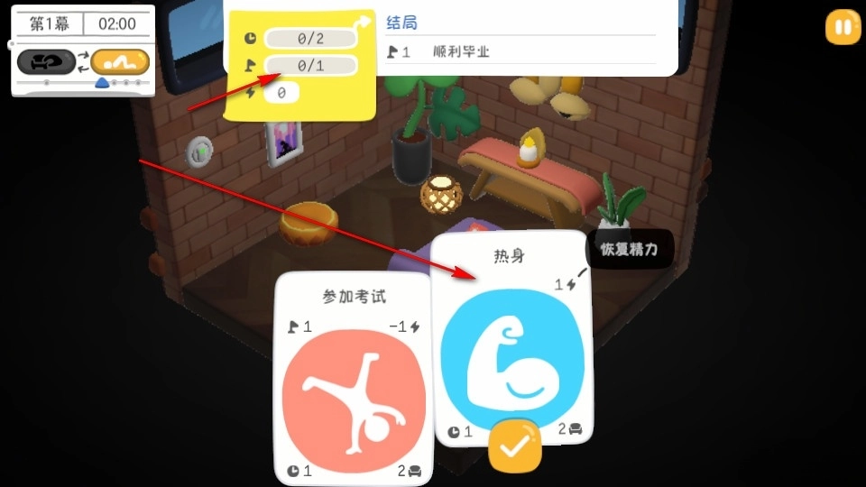 玩家选择布置操作后,游戏内会弹出可供选择的卡片;界面顶部显示着玩家当前的精力条与体力条;要达成最终目标,需先协助主角在游戏里完成相应的动作。