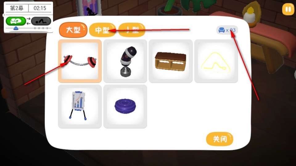 玩家完成一个项目后会解锁更多摆设物品,右上角显示可摆放物品的上限数量,左上方可选择大、中、小型家具,选好所需家具后就能开启下一个任务。