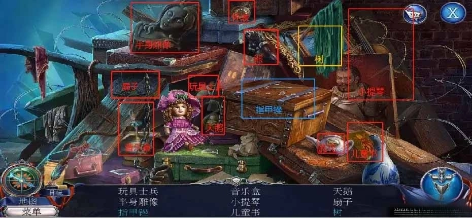 注:“树”需要先扯开布,“指甲锉”需要先打开箱子