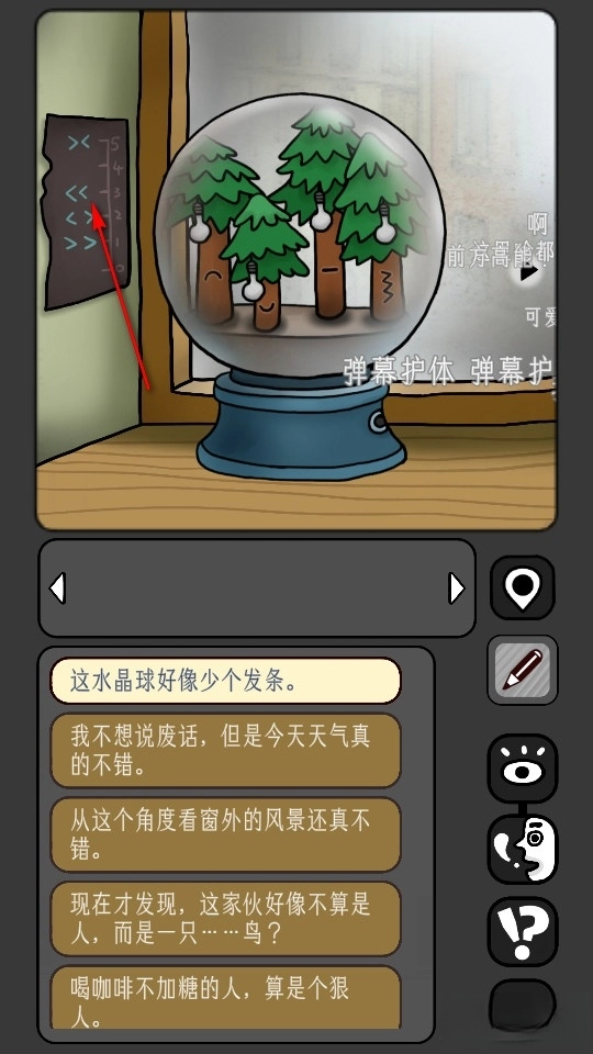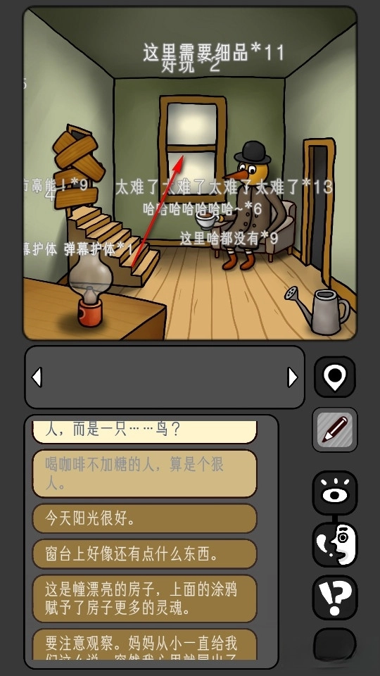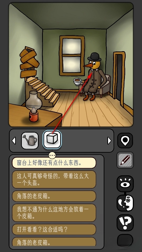 在楼上那位端着茶杯坐着休息的人旁边的窗户处,我们只需点击该窗户就行。