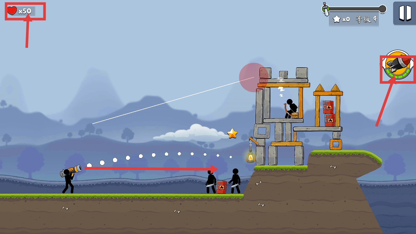 进入关卡后,留意【心x50】的生命值状态,借助右侧的火箭武器,对准敌方建筑展开攻击,以推进战斗进程。