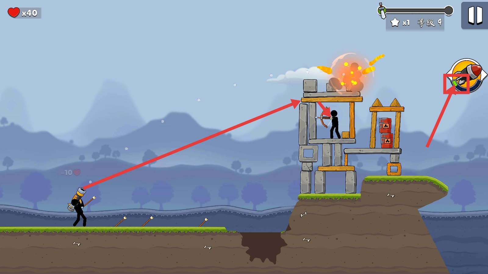战斗时用火箭武器攻击敌方弓箭手,留意生命值的变化情况,收集星星来提高关卡评分。
