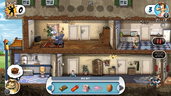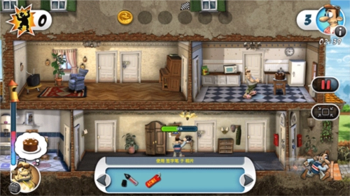 1、进入游戏后,第一步是收集整蛊道具。可以在五斗柜找到“放屁坐垫”,从卫生间的医药箱里获取“强力胶”,还能在厨房冰箱中拿到“鸡蛋”。
