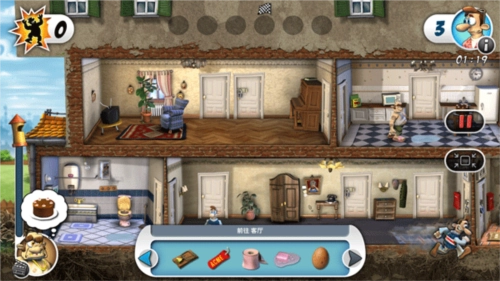 去厨房取香蕉皮和蜂蜜,接着上三楼拿陶土与钥匙;之后到客厅取鞋刷、图钉。钥匙放在卫生间柜子里,香蕉皮丢在1楼地板上;进卫生间把鞋刷换成牙刷。等他去浇花时,将陶土放进咖啡罐;等他去厨房时,上楼把蜂蜜替换成防晒液,收起伞,把图钉放在椅子上,把喷壶换成除草剂,最后钻进床下就能过关。这样操作会中断一次连击,但花费的时间比较短。