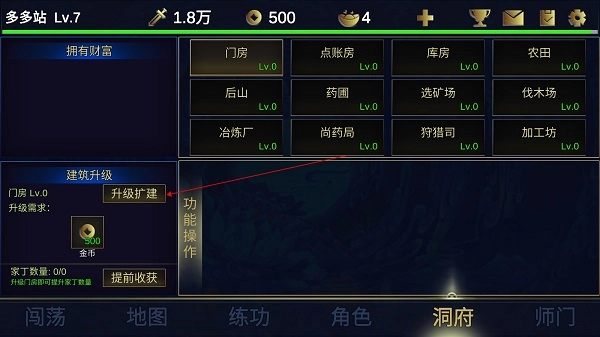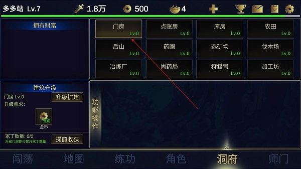 升级洞府中的门房即可提升家丁的数量