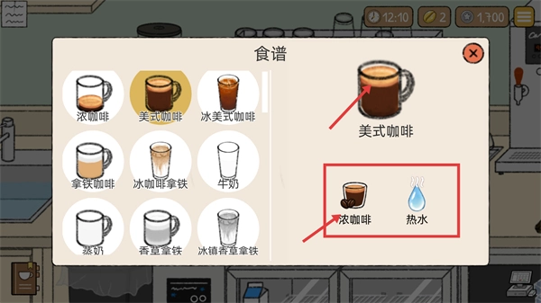 打开【食谱】界面查看【美式咖啡】的配方,了解到制作它需要用到【浓咖啡】和【热水】,当时界面显示的时间是【12:10】。