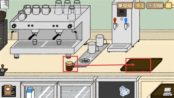 把制作好的【美式咖啡】放到【托盘】上,完成配送前的准备工作,界面时间也会同步更新为【12:40】。