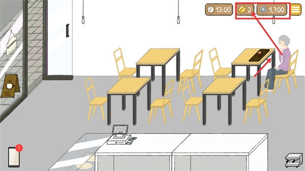 把【美式咖啡】配送给对应的顾客,把界面时间调整为【13:00】,并且领取【2】个金币和【1700】颗星星的奖励。