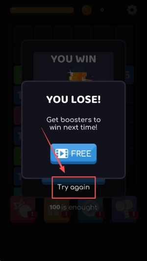 结算结束:当屏幕显示“YOU WIN”或“YOU LOSE!”时,点击“Tryagain”按钮可重新发起挑战。