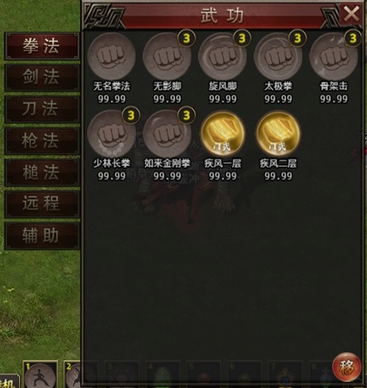 所有武功每次升层后都会重置为1级,需继续修炼直至达到满级(99.99级)。